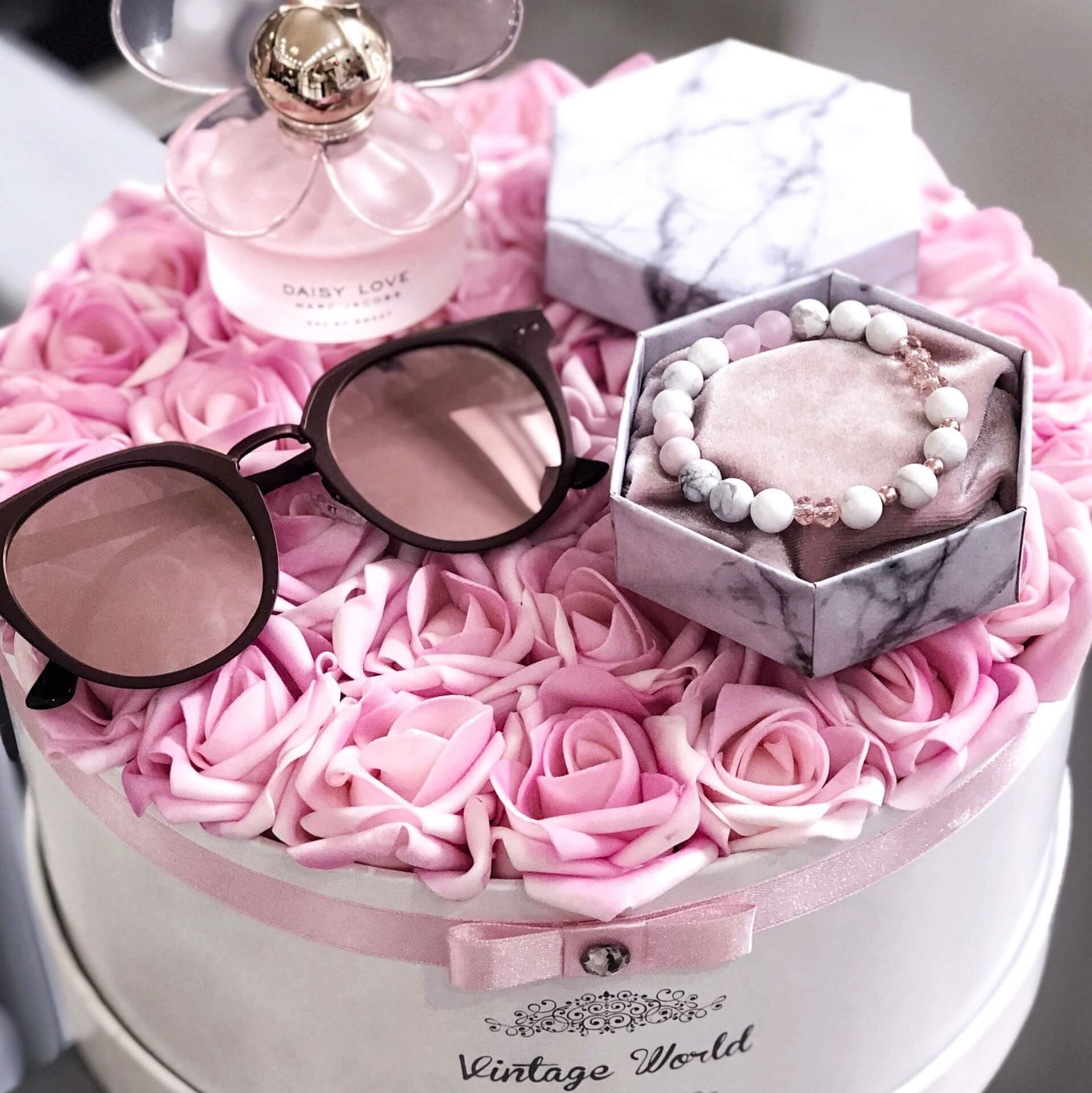 VI. NYEREMÉNY: Egy ajándékcsomag, — melynek tartalma egy Marc Jacobs Daisy Love parfüm, egy karkötő karkötő, egy napszemüveg és egy 35 szálas habrózsa doboz.